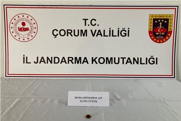 Çorum İl Jandarma Komutanlığı tarafından yapılan açıklamada, Kültür Ve Tabiat Varlıkları Kaçakçılığı ile mücadele kapsamında yapılan çalışmalar neticesinde; Çorum ili Sungurlu ilçesine bağlı bir köyde ikamet eden şüpheli bir şahsın tarihi niteliği olan eserleri satmaya çalıştığı yönünde alınan bilgi üzerine şüpheli şahsın evinde ve eklentilerinde adli makamlardan alınan arama kararına istinaden yapılan aramada; Roma dönemine ait olduğu değerlendirilen yaklaşık 1500 yıllık (1) adet altın yüzük ele geçirilmiştir denildi.