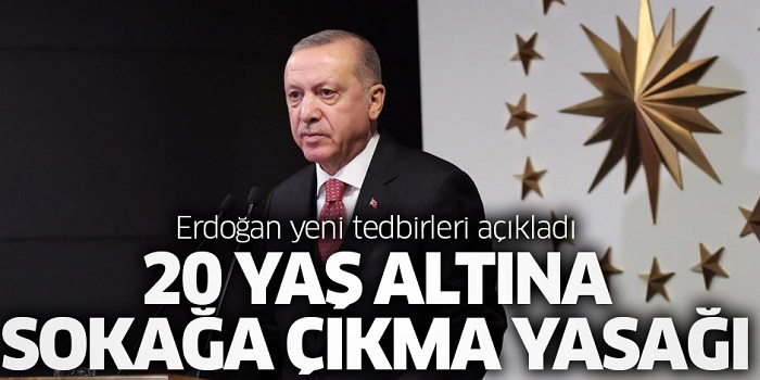 Erdoğan açıklamasında koronavirüsle mücadele kapsamında alınan yeni tedbirleri açıkladı. Erdoğan’ın açıklamalarına göre 20 yaş altında olanlara da sokağa çıkma yasağı getirildi. 30 büyükşehirle birlikte Zonguldak’a araç giriş çıkışı yasaklandı ve toplu alanlarda maske takmak zorunlu hale getirildi.
