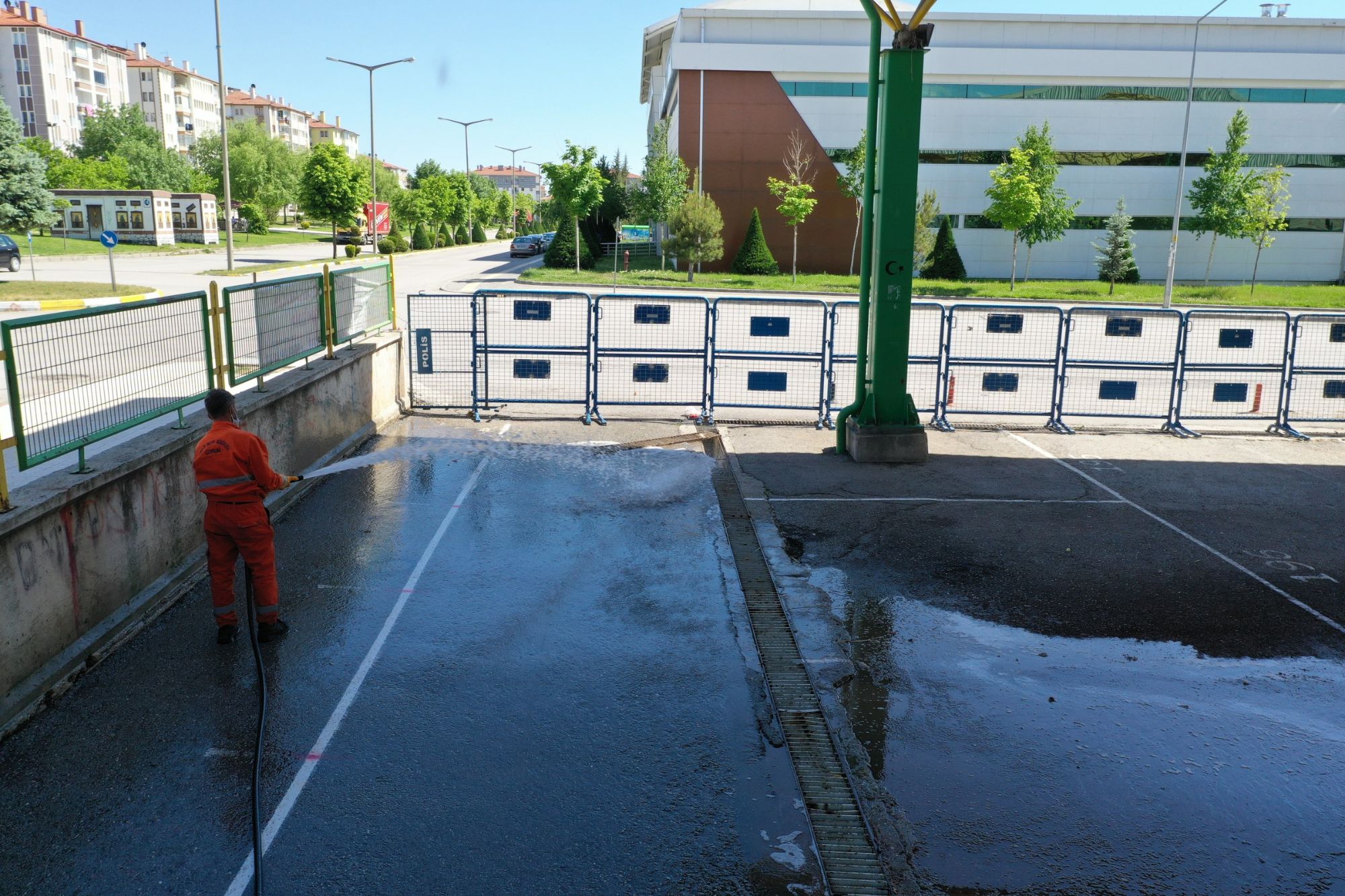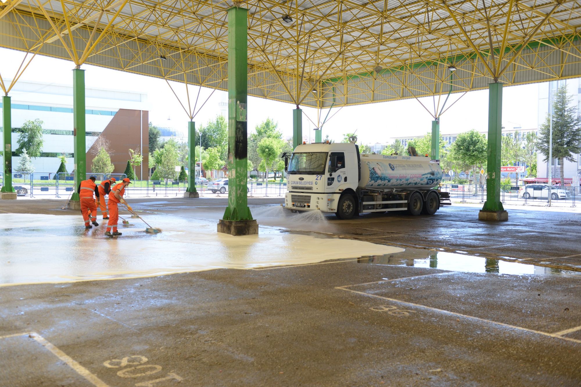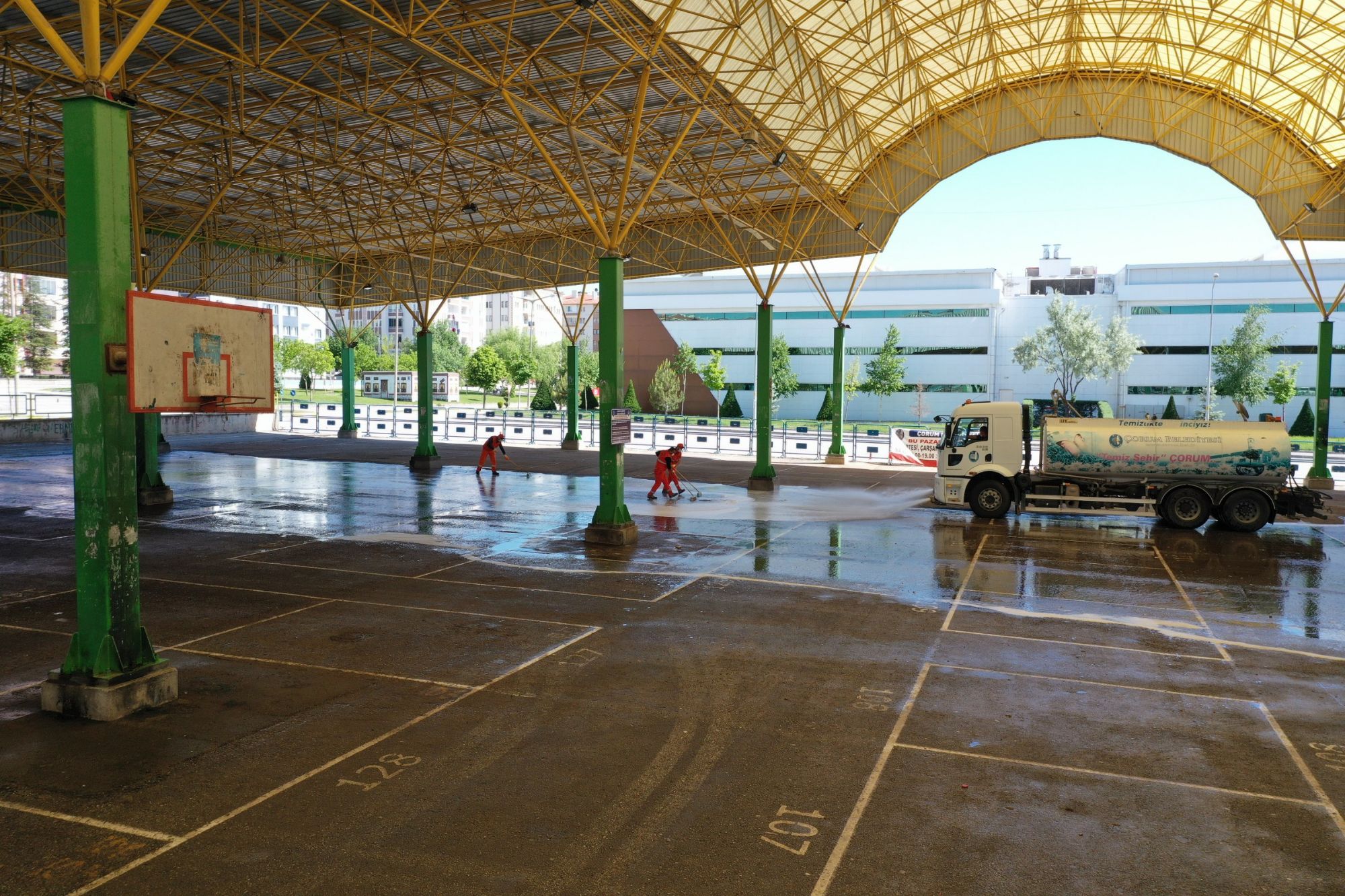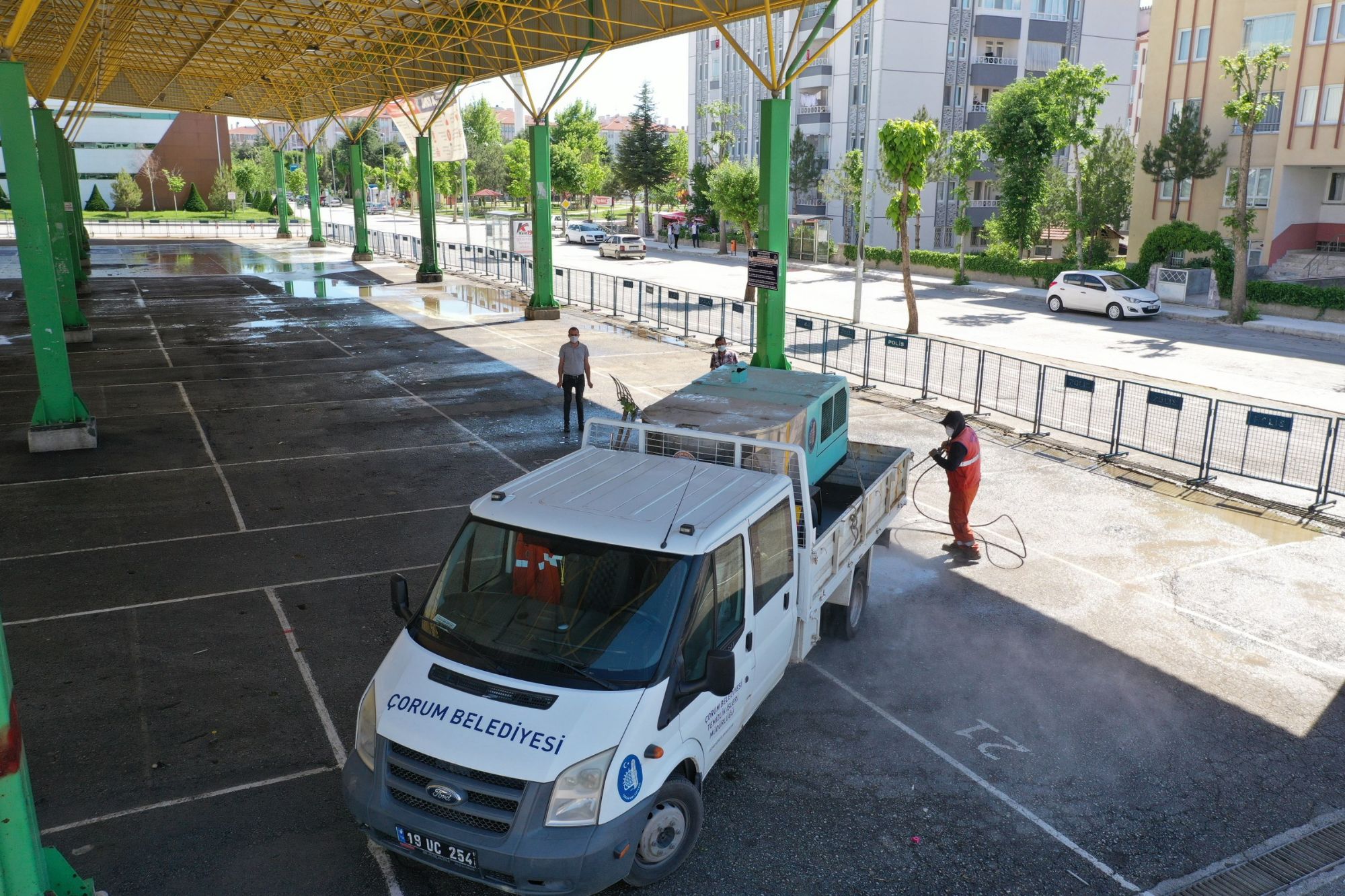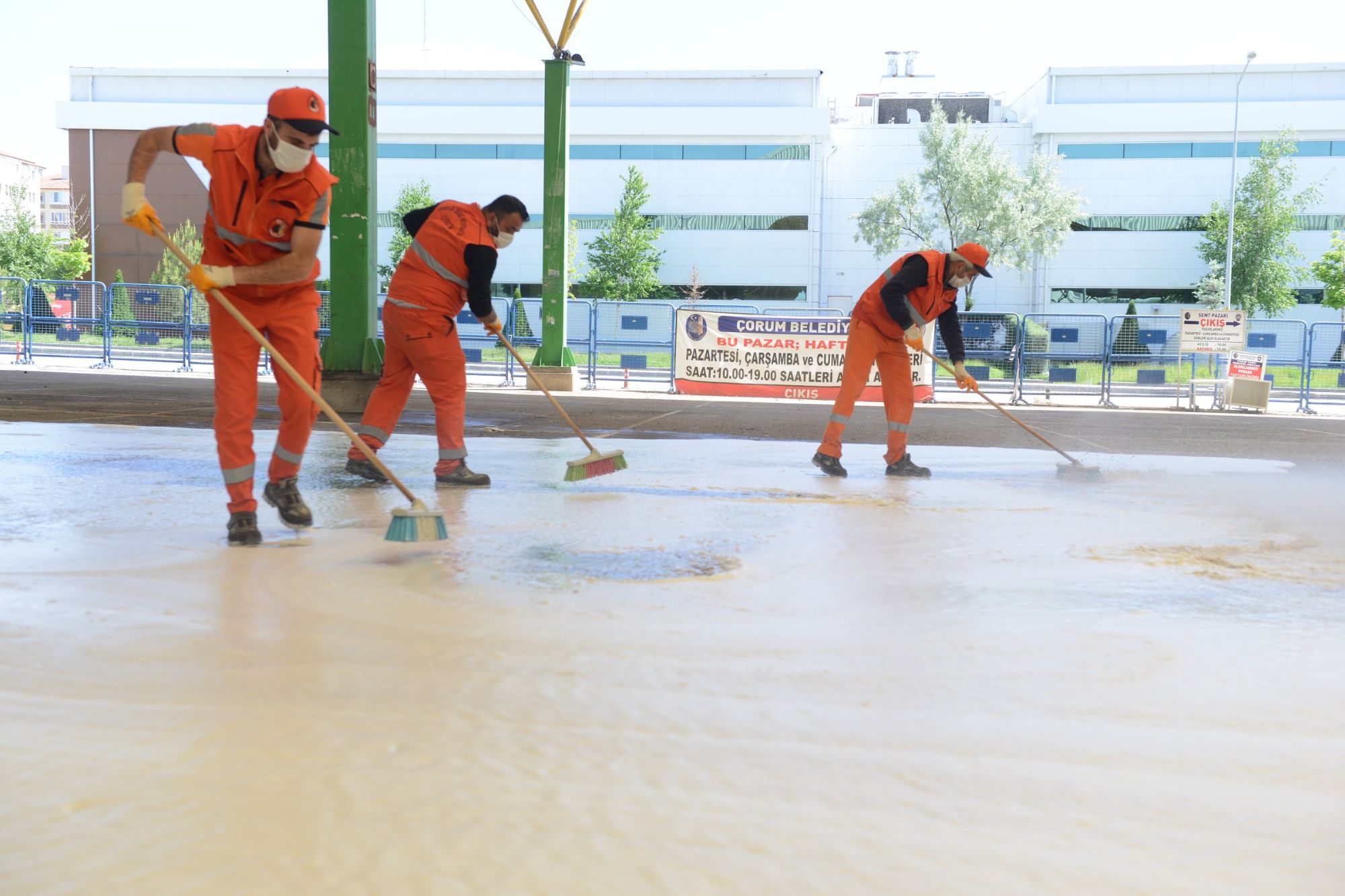 Çorum Belediyesi, 29 Mayıs tarihi itibariyle öğle, ikindi ve Cuma namazlarının cemaatle kılınacağı camilerde dezenfeksiyon çalışmalarını yürütürken diğer yandan da cemaatle namaz kılınması için İl Müftülüğü tarafından belirlenen okul bahçeleri ve Pazar yerlerinde de çalışmalarını sürdürüyor.
