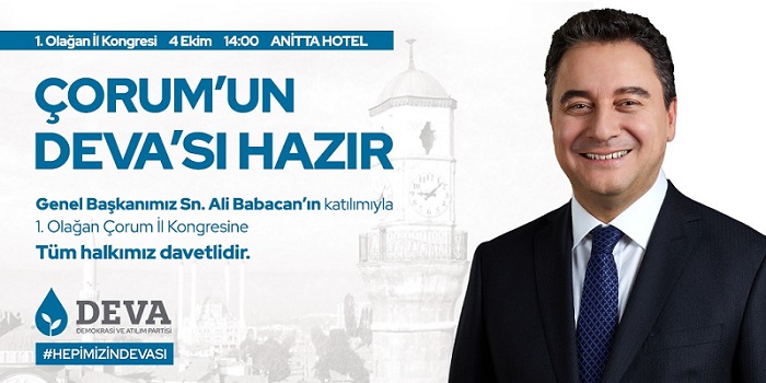 Deva Partisi il başkanı Orhan Vargeloğlu, 4 ekim 2020 pazar saat 14:00’de Demokrasi ve Atılım Partisi il kongrelerine Çorum’dan start verecek Genel Başkanımız Sayın Ali Babacan’ı Çorumlu hemşerilerimizin en iyi şekilde ağırlayacağından şüphesinin olmadığını ve herkesi saat 14:00’de Anitta Otel’de beklediklerini kaydetti.