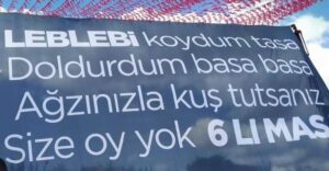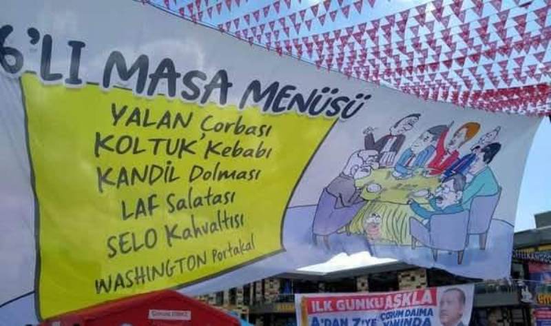 “6’lı Masa menüsü yalan çorbası, koltuk kebabı, kandil dolması, laf salatası, selo kahvaltısı, Washıngton Portakalı “ yazan pankatı okuyan Erdoğan, ardından da “Leblebi koydum tasa, doldurdum basa basa, ağzınızla kuş tutsanız, size oy yok 6’lı Masa” pankatını okuyarak, “Burası neresi” diye sorarak, alanı dolduran onbinlerce Çorumludan “Çorum” cevabını aldı.