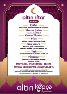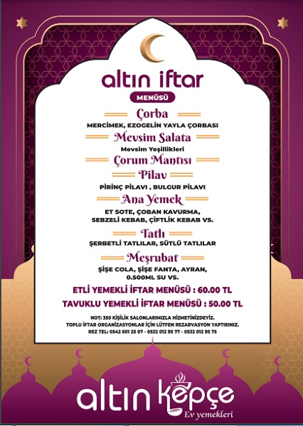 Çorum Merkez saat kulesi civarında ve Küçük sanayi sitesinde bulunan iki işletmesi ile açıldığından bu güne halkın yoğun ilgi gösterdiği “Altın Kepçe” 60 liraya Et menüsü ve 50 lira tavuk menüsü ile Ramazan ayı boyun Çorum halkına hizmet verecek.
