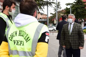 Koronavirüs tedbirleri kapsamında evde kalan 65 yaş ve üzeri vatandaşlar ile kronik rahatsızlığı bulunanların istek ve ihtiyaçlarını karşılamak amacıyla Çorum Belediyesi tarafından oluşturulan Vefa Sosyal Destek Grubunun büyük fedakârlıkla çalıştığını söyleyen Başkan Aşgın, “Belediyemiz bünyesinde 16 kişiden oluşan bir ekip kurduk. Hemşehrilerimiz Alo 153 Zabıta ve Gönül Kapısı aracılıyla bizlere ulaştığı zaman, ihtiyaçlarını karşılıyoruz. Gayretle çalışan tüm ekibimize teşekkür ediyorum. Siz evde kalın, biz sizin için gece gündüz çalışmaya devam ediyoruz’’dedi.