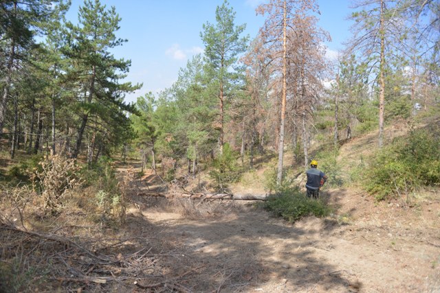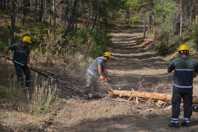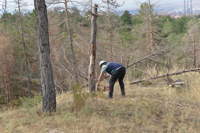 Çorum Belediyesi ve Orman İşletme Müdürlüğü ekipleri, Bahabey Çamlığı’nda istilacı böceklerin kuruttuğu ağaçları temizliyor.