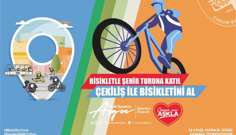 Avrupa hareketlilik haftası etkinlikleri kapsamında Çorum Belediyesi bisikletle şehir turu düzenliyor. 16.09.2022 Cuma Günü saat 18.00’da Kültür Park’tan(İtfaiye Müdürlüğü Yanı) başlayacak tur Millet Bahçesinde noktalanacak. Belediye etkinlik günü Çorbis’i de ücretsiz yapacak. Katılımcıların kendi bisikletleriyle ya da Çorbis’le katılım sağlayabileceği etkinlik sonrasında yapılacak çekilişle 10 adet bisiklet hediye edilecek.