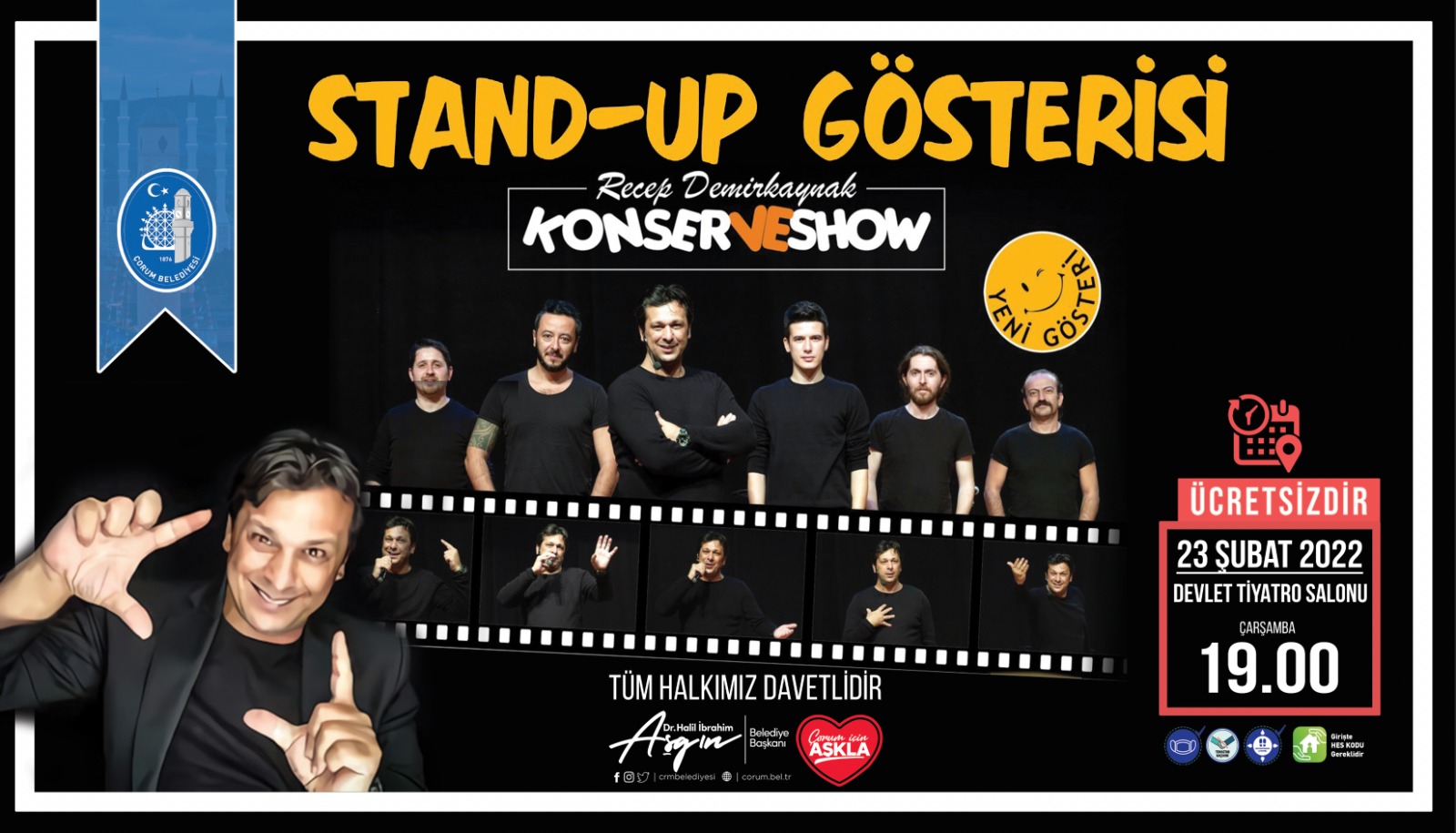 Birbirinden güzel kültürel etkinlikler düzenleyen Çorum Belediyesi, usta komedyen Recep Demirkaynak’ı Çorumlularla buluşturuyor. Demirkaynak’ın Konseri ve Stand-Up gösterisi 23 Şubat Çarşamba günü saat: 19.00’da Devlet Tiyatro Salonunda yapılacak.