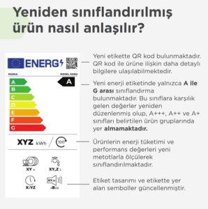 Yeni enerji etiketi ile genel olarak bilinen ve performans sınıfı bilgisi içinde yer alan A+++ şeklindeki gösterim değiştirilmiş olup, en üst performans sınıfı A ve en alt performans sınıfı G olarak belirlenmiştir. Halihazırda A++ olarak satılmakta olan bir buzdolabı için enerji sınıfı F olabilmektedir. Ürünün enerji performansında bir değişiklik bulunmamakta, yeni uygulama tebliğleri ile getirilen hesaplama yöntemi sonucu belirlenen enerji sınıfı yeni enerji etiketi içerisinde yer almaktadır.