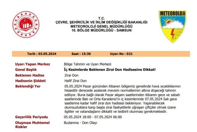Buna bağlı olarak Pazar akşam saatlerinden itibaren gece ve sabah saatlerinde Batı ve Orta Karadeniz’in iç kesimlerinde 07.05.2024 Salı gece saatlerine kadar hafif zirai don hadisesi bekleniyor. Yaşanabilecek olumsuzluklara karşı başta zirai faaliyetlerle uğraşan çiftçiler olmak üzere ilgililer ve vatandaşların dikkatli ve tedbirli olunması gerekmektedir.