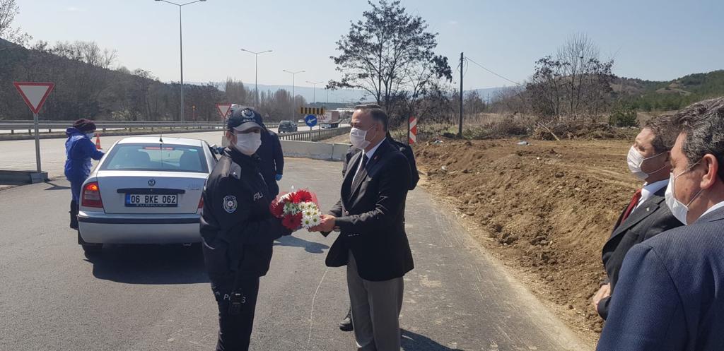 Beraberinde Merkez İlçe Başkanı Ulaş Tokgöz, İl Yönetiminden Ferda Suiçmez, Ümit Er ve İl Gençlik Kolları Başkanı Onur Topkül ile birlikte Çorum – Samsun ve Çorum – Ankara yolu üzerinde uygulama ve kontrol faaliyetlerini yürüten polis memurlarını ziyaret eden Tahtasız, Polis Haftasını kutlayarak günün anısına karanfil hediye etti.