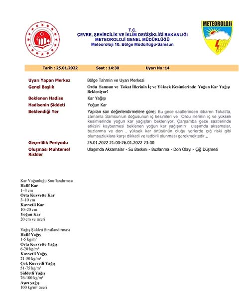 “Yapılan son değerlendirmelere göre bu gece saatlerinden itibaren Tokat’ta, zamanla Samsun’un doğusunun iç kesimler ve Ordu’nun iç ve yüksek kesimlerinde yoğun kar yağışı bekleniyor. Çarşamba gece saatlerinde etkisini kaybetmesi beklenen yoğun kar yağışının ulaşımda aksamalar, buzlanma ve don, yüksek kar örtüsünün olduğu yerlerde çığ riski gibi olumsuzluklara karşı dikkatli ve tedbirli olunması gerekmektedir.”