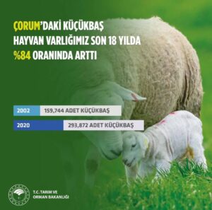 Küçükbaş hayvan varlığımız 2002’de 159.744 adet iken %84 oranında arttırarak 2020’de 293.872 adete çıkarttık. Küçükbaş hayvan varlığımız %69,3 artış ile 54,1 milyona ulaşarak, küçükbaş hayvan varlığında Avrupa’da 1. sıraya yükseldik.