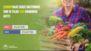Sebze üretimimiz 2002’de 272,417 ton iken %37 oranında arttırarak 2020’de 373,672 tona ulaştırdık.