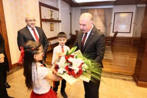 Makamı devralan Temsili Vali Yeler, yaptığı konuşmada 23 Nisan’ın barış ve kardeşliğe vesile olmasını dileyerek, “Mustafa Kemal Atatürk’ün bizlere armağan ettiği bu anlamlı günde, tüm dünya çocuklarının savaşlardan uzak, barış içinde yaşamasını diliyorum. Atatürk ve silah arkadaşları başta olmak üzere tüm şehitlerimize saygılarımı sunuyorum. Ayrıca bizlerden desteğini esirgemeyen, daima okulların yanında olan ve bizleri makamında ağırlayan Sayın Valimize şükranlarımı sunuyorum. Bugünün çocukları, yarının büyükleri olarak bize verilen emaneti en iyi şekilde taşıyacağız” dedi.