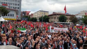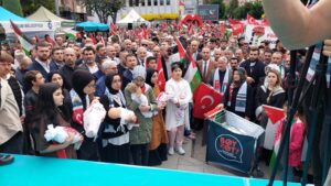 Ellerinde Türk ve Filistin bayraklarıyla Valilik önünde Hürriyet meydanına onbinlerce kişi ‘Katil İsrail Filistin’den defol’ sloganlarıyla yürüdü.