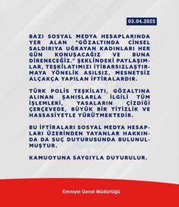 “Bazı sosyal medya hesaplarında yer alan ‘Gözaltında cinsel saldırıya uğrayan kadınları her gün konuşacağız ve buna direneceğiz.’ şeklindeki paylaşımlar, teşkilatımızı itibarsızlaştırmaya yönelik asılsız, mesnetsiz, alçakça yapılan iftiralardır. Türk Polis Teşkilatı, gözaltına alınan şahıslarla ilgili tüm işlemleri, yasaların çizdiği çerçevede, büyük bir titizlik ve hassasiyetle yürütmektedir. Bu iftiraları sosyal medya hesapları üzerinden yayanlar hakkında da suç duyurusunda bulunulmuştur.”