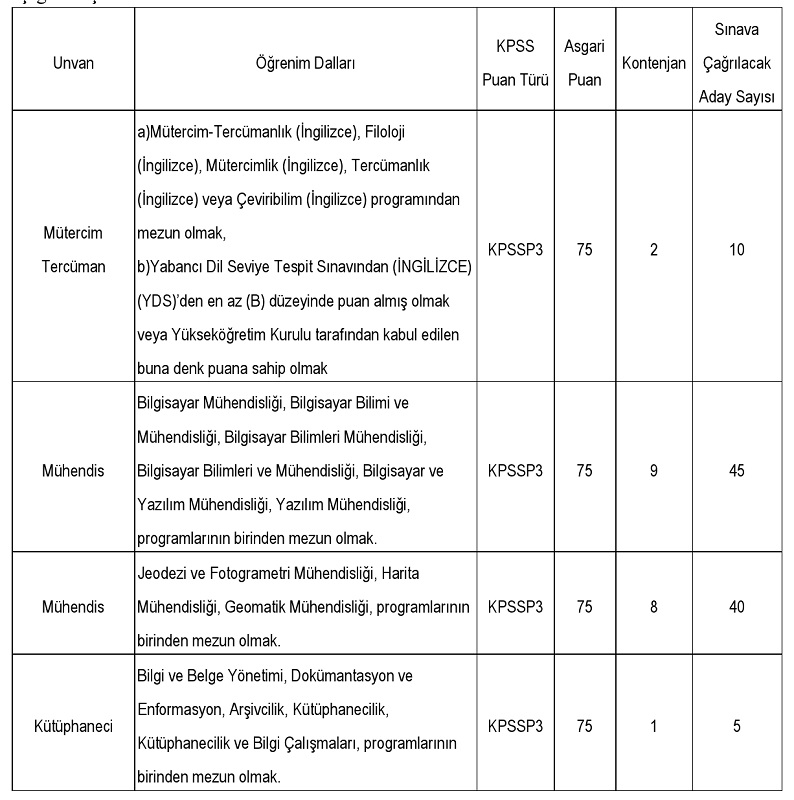 Giriş sınavı yapılacak 2 (iki) adet Mütercim Tercüman, 17 (on yedi) adet Mühendis, 1 (bir) adet Kütüphaneci, 2 (iki) adet Çözümleyici, 14 (on dört) adet Yönetim Görevlisi, 5 (beş) adet İletişim Görevlisi, 4 (dört) adet Şoför ve 2 (iki) adet Teknisyen kadrosunun öğrenim dalları itibariyle dağılımı, KPSS puan türleri, asgari puan, kontenjanlar ve sınava çağrılacak aday sayıları aşağıdaki şekildedir: