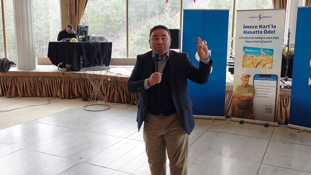 Türkiye İş Bankası Tarım Bankacılığı Pazarlama Bölümü’nden Tarım Uzmanı Metin Yüksel Bölüm tarafından yapılan sunumda İş Bankası’nın üreticilere yönelik başta hasattan hasata ya da kurbandan kurbana yılda bir ödemeli uygun faiz oranlı tarım kredileri, İmece Kart, İmeceMobil, sulama sistemleri kredisi, ELÜS Kredisi, zirai dron kredisi gibi ürünleri anlatılırken, üreticilerin finansal anlamda farkındalıklarını yükseltmek üzere gelir-gider dengelerini nasıl sağlayacakları ve finans kuruluşlarını ne şekilde kullanırlarsa faydalarına olacağı konularında eğitim niteliğinde bilgiler aktarıldı.