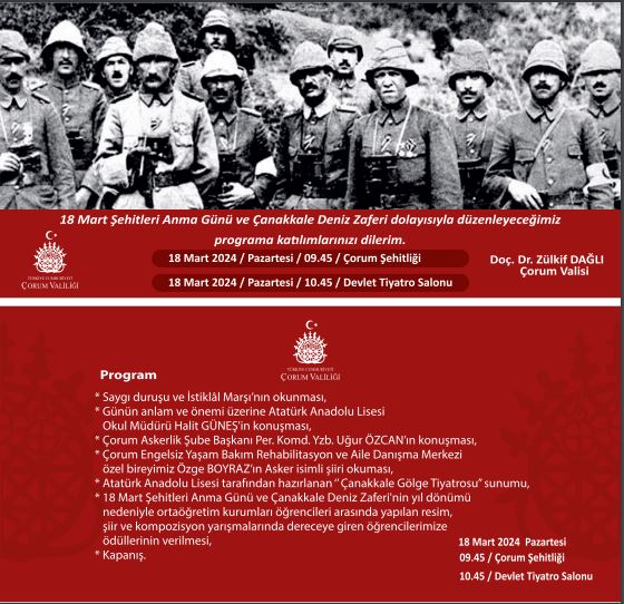 Çorum Valisi Doç. Dr. Zülkif DAĞLI, 18 Mart Çanakkale Zaferi ve Şehitleri Anma Günü nedeniyle Mesaj yayımladı.