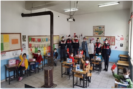 Ziyaret esnasında kız ve erkek çocuklara uygun düzeyde oyuncak, seviyelerine uygun okuma kitabı, Türk Bayrağı ve Jandarma Trafik Boyama Kitapları dağıtıldı.
