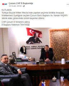 CHP’li Tahtasız, partisinin kurumsal sosyal medya hesaplarından Kenan Yaşar’a daha önce yaptığı bir ziyaret görselini paylaşarak, şöyle dedi: “Türkiye Büyük Millet Meclisi’nde yapılan seçimle birlikte Anayasa Mahkemesi Üyeliğine seçilen Çorum Baro Başkanı Av. Kenan Yaşar’ı tebrik eder, görevinde üstün başarılar dileriz.”