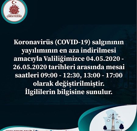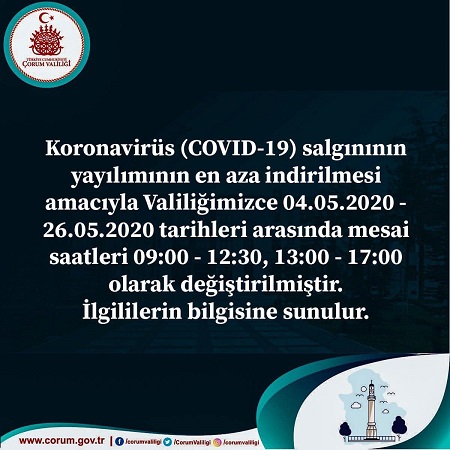 Çorum valiliğinden yapılan açıklamada 04.05.2020 ve 26.05.2020 tarihleri arasında mesai saatleri 09:00-12:30, 13:00-17:00 olarak değiştirildi.
