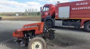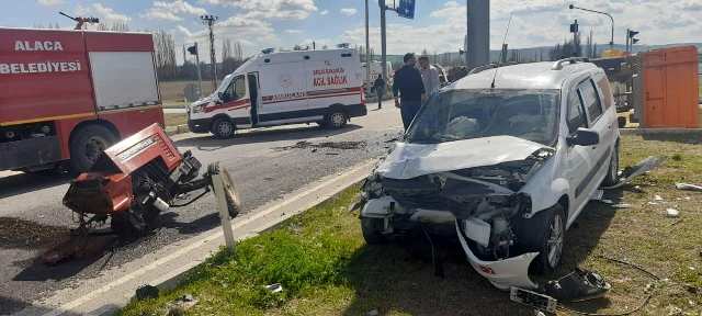 Edinilen bilgilere göre, Kaza, Alaca Çevreyolunda meydana geldi. Ankara’dan Tokat’a giden K. B. yönetimindeki 06 AUA 55 plakalı otomobil ile R.B. yönetimindeki buğday yüklü traktör Mezbaha kavşağında çarpıştı. Çarpışmanın etkisiyle traktör ikiye ayrıldı. Devrilen römorkta bulunan buğdaylar ise yola saçıldı. Yoldan geçen sürücülerin ihbarı üzerine olay yerine polis, itfaiye ve sağlık ekipleri sevk edildi.