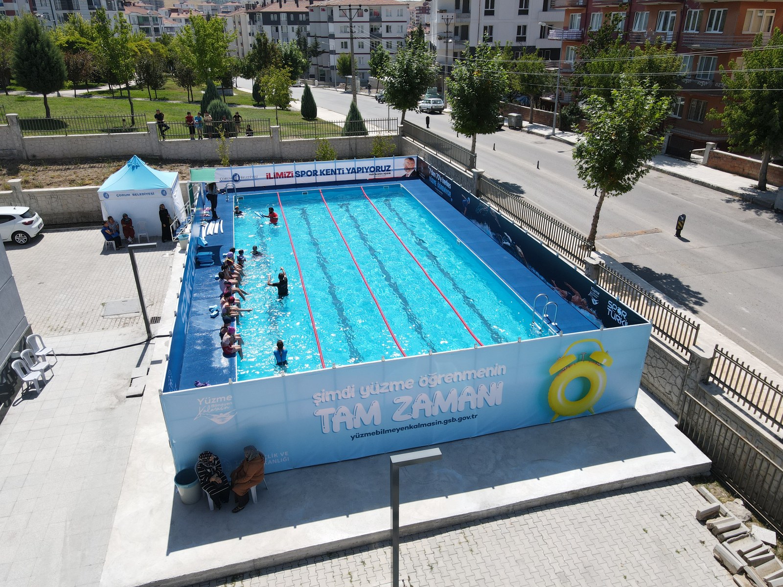 Gençlere ve spora yönelik yatırımlarında hız kesmeyen Çorum Belediyesi önemli bir projeyi daha hizmete sundu. Gençlik ve Spor Bakanlığı’nın “7’den 70’e Yüzme Bilmeyen Kalmasın” projesi kapsamında Çorum Belediyesi’nin destekleriyle Çorum’daki 4 farklı mahalleye kurulan portatif yüzme havuzları kullanıma sunuldu.