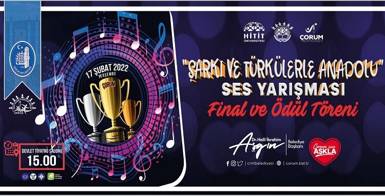 Çorum Belediyesi, Hitit Üniversitesi, İl Milli Eğitim Müdürlüğü ve Kent Konseyi işbirliği ile düzenlenen “Şarkı ve Türkülerle Anadolu” ses yarışmasında final ve ödül töreni 17 Şubat Perşembe günü saat 15.00’te Devlet Tiyatro Salonu’nda yapılacak.