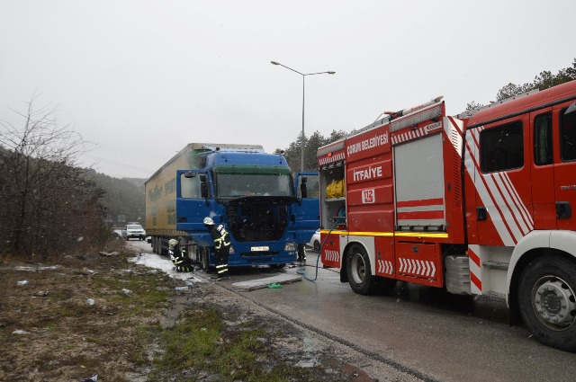 Çorum’da, seyir halindeki TIR’ın motor kısmı aniden alev aldı. Araçtan duman çıktığını gören Azeri sürücü son anda kurtuldu.