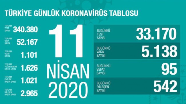 Açıklamada bugün 95 kişinin hayatını kaybettiği bildirildi. 33 bin 170 test sayısından 5 bin 138 kişinin testinin pozitif çıktığı açıklandı. 542 hasta iyileşirken 95 kişi vefat etti. Vefat eden sayısı 1101’e ulaştı.